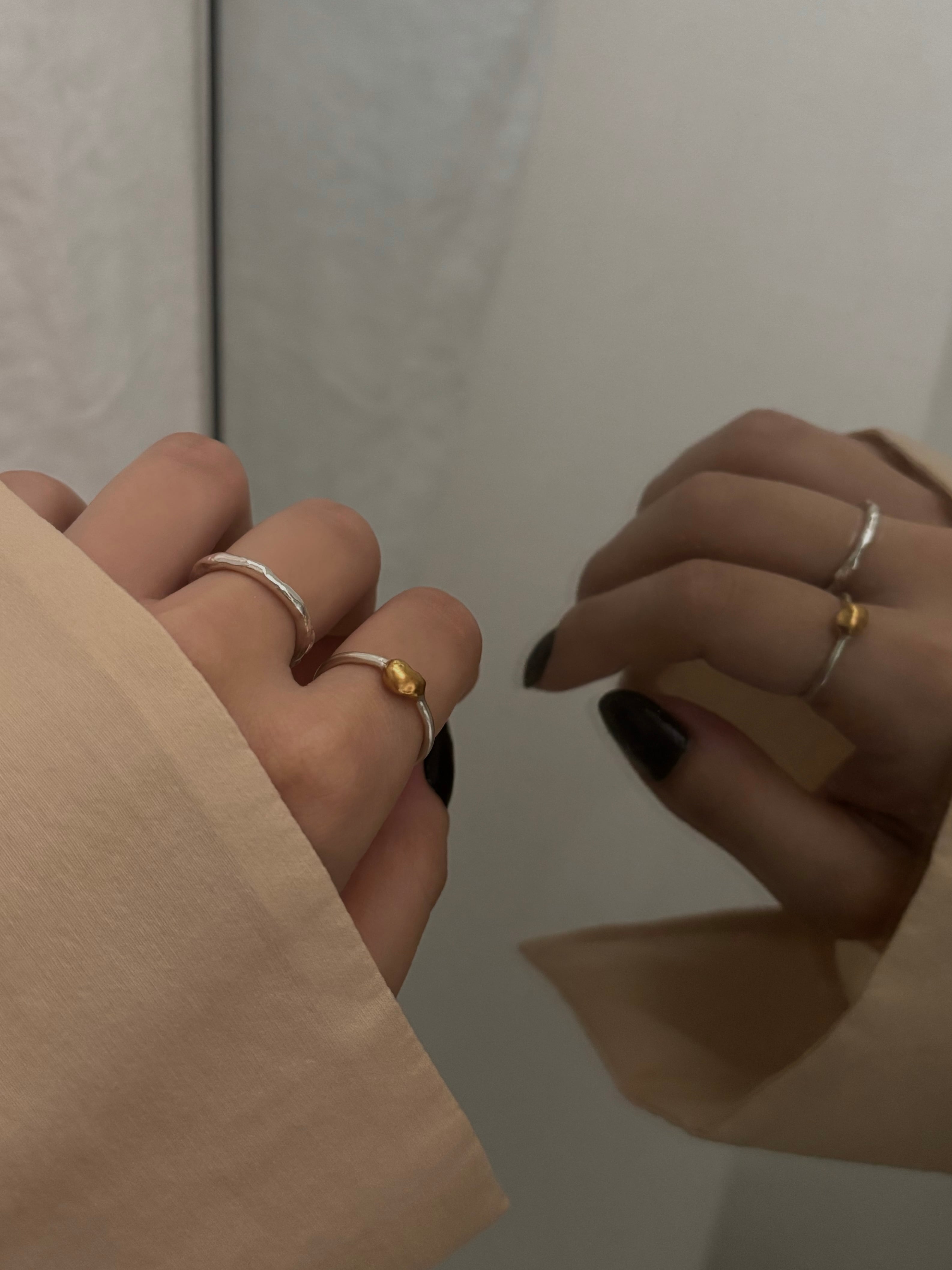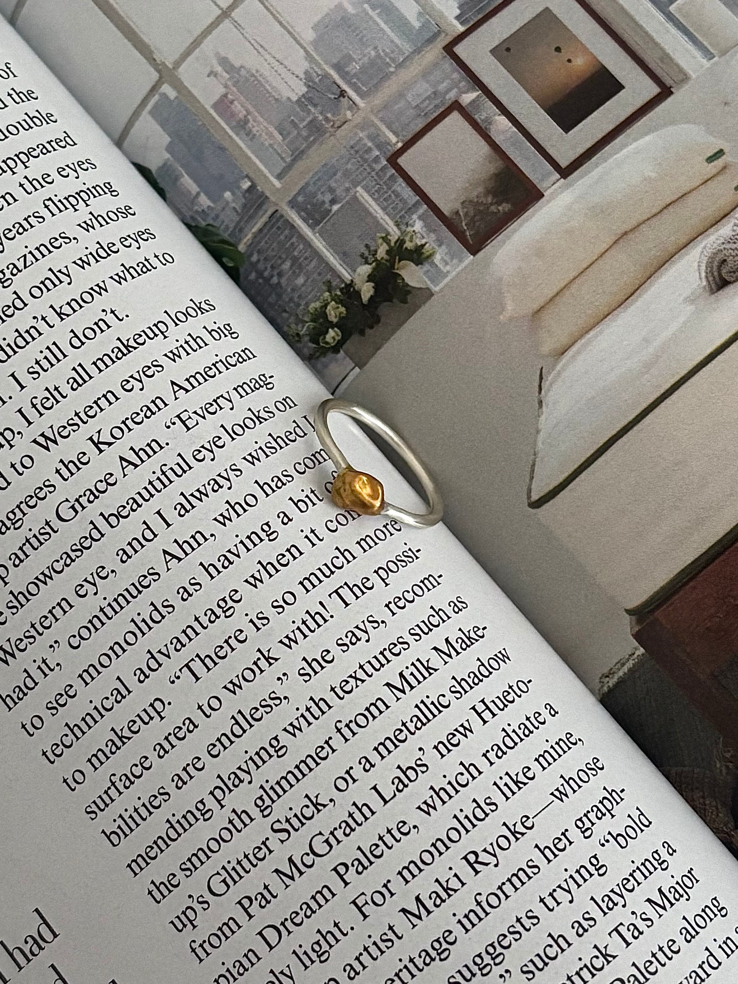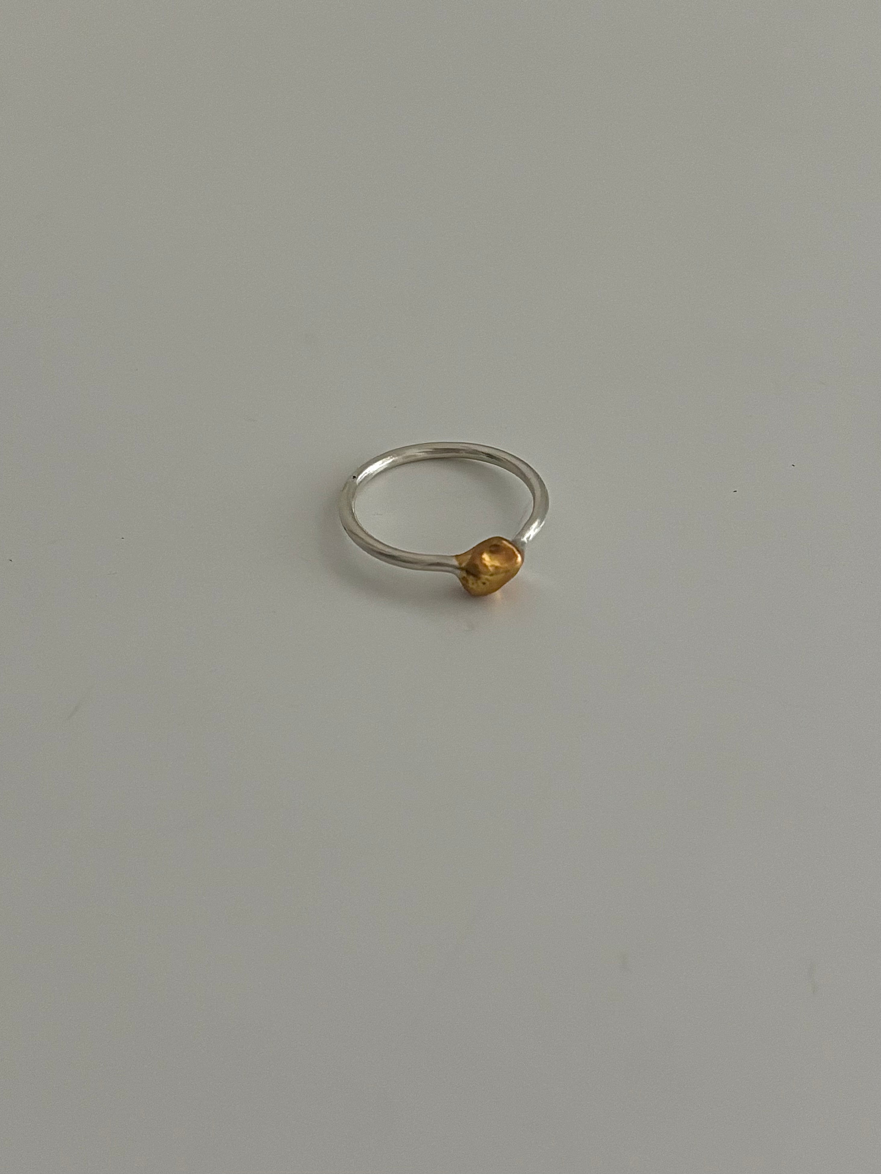 マットな質感で控えめな輝きを放つ、シルバーとゴールドの組み合わせが特徴のリングです。