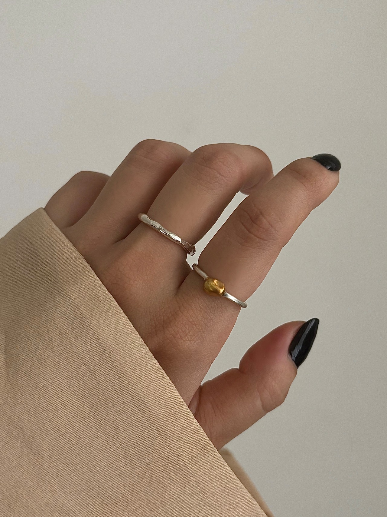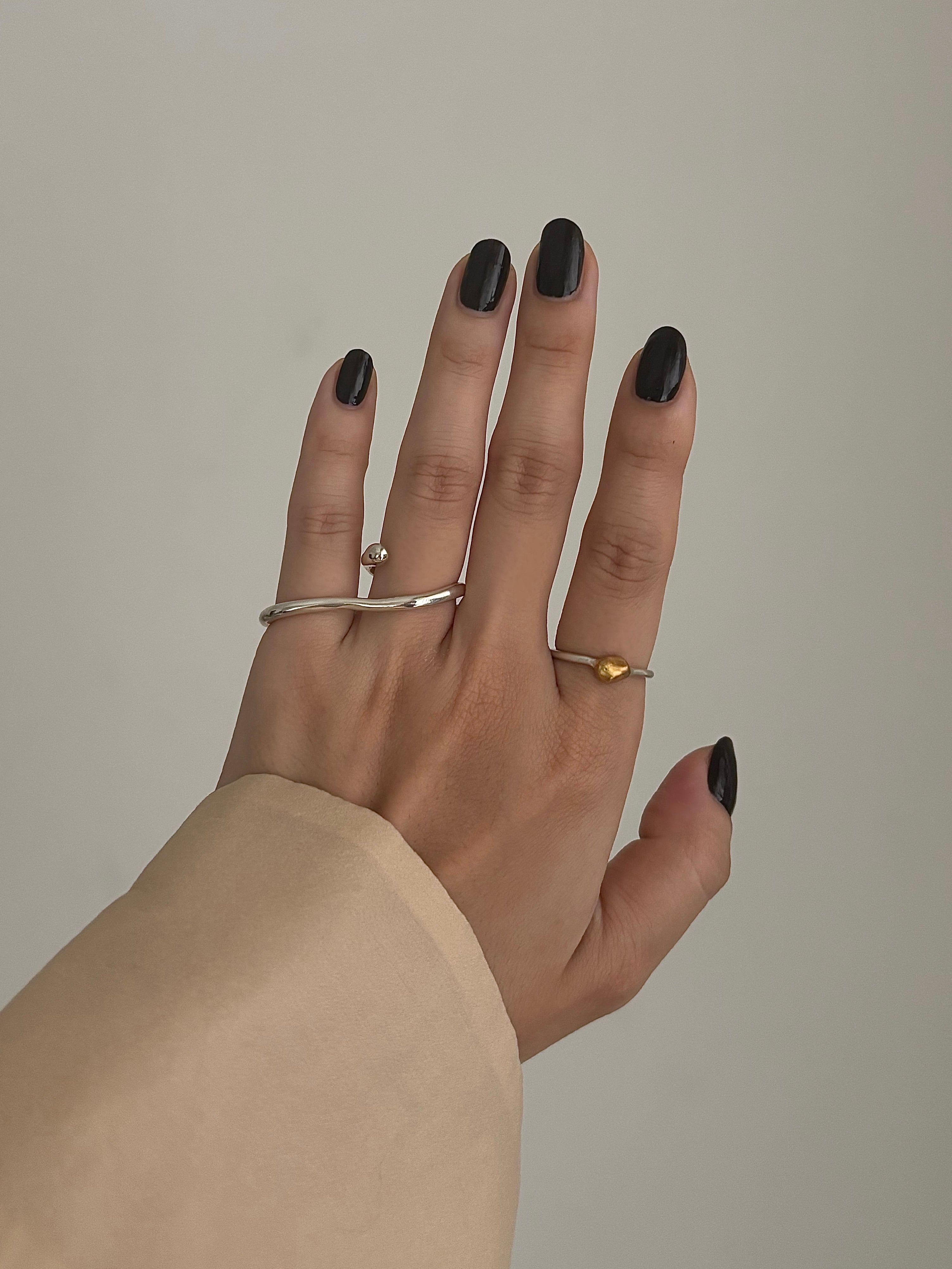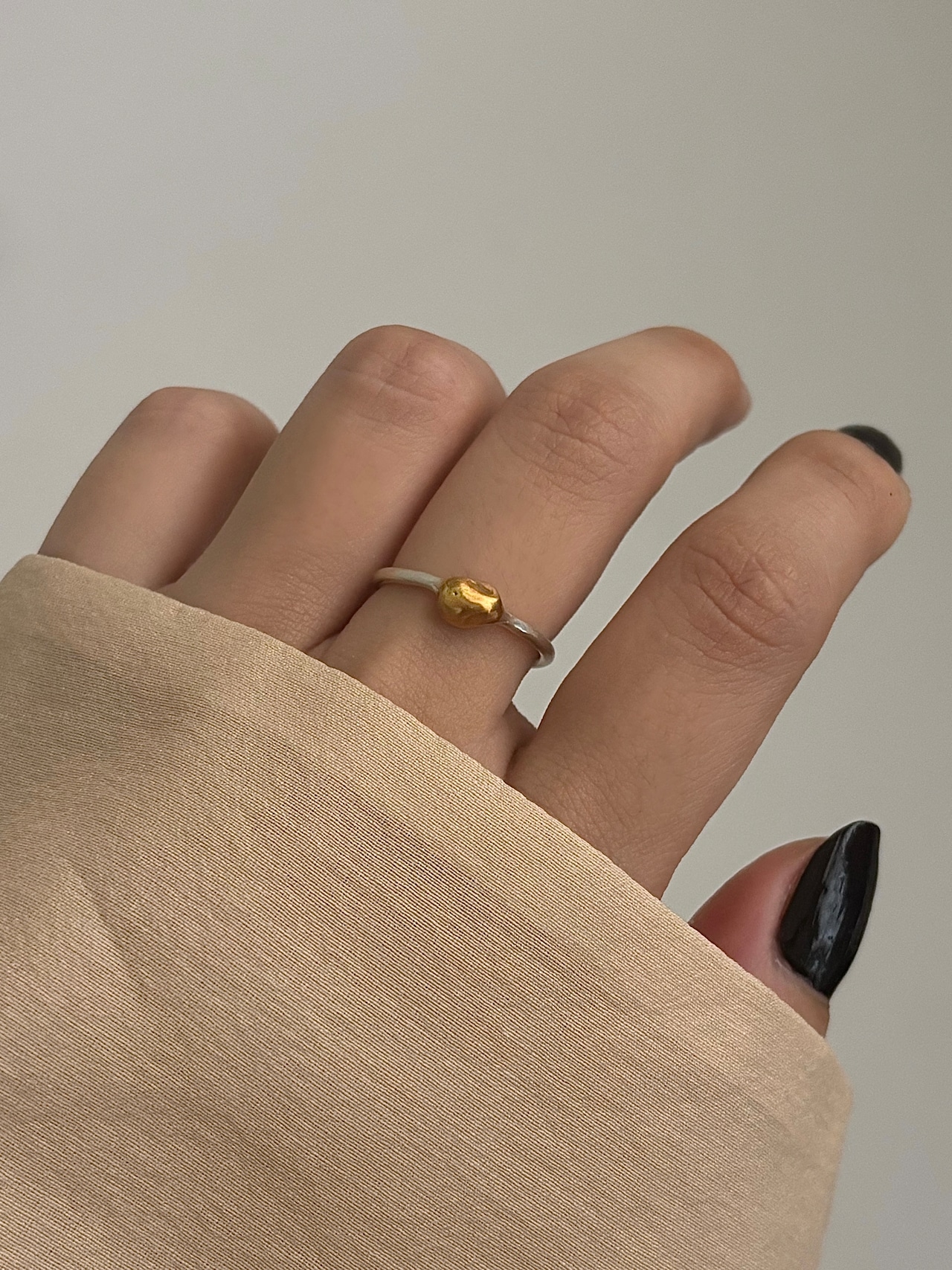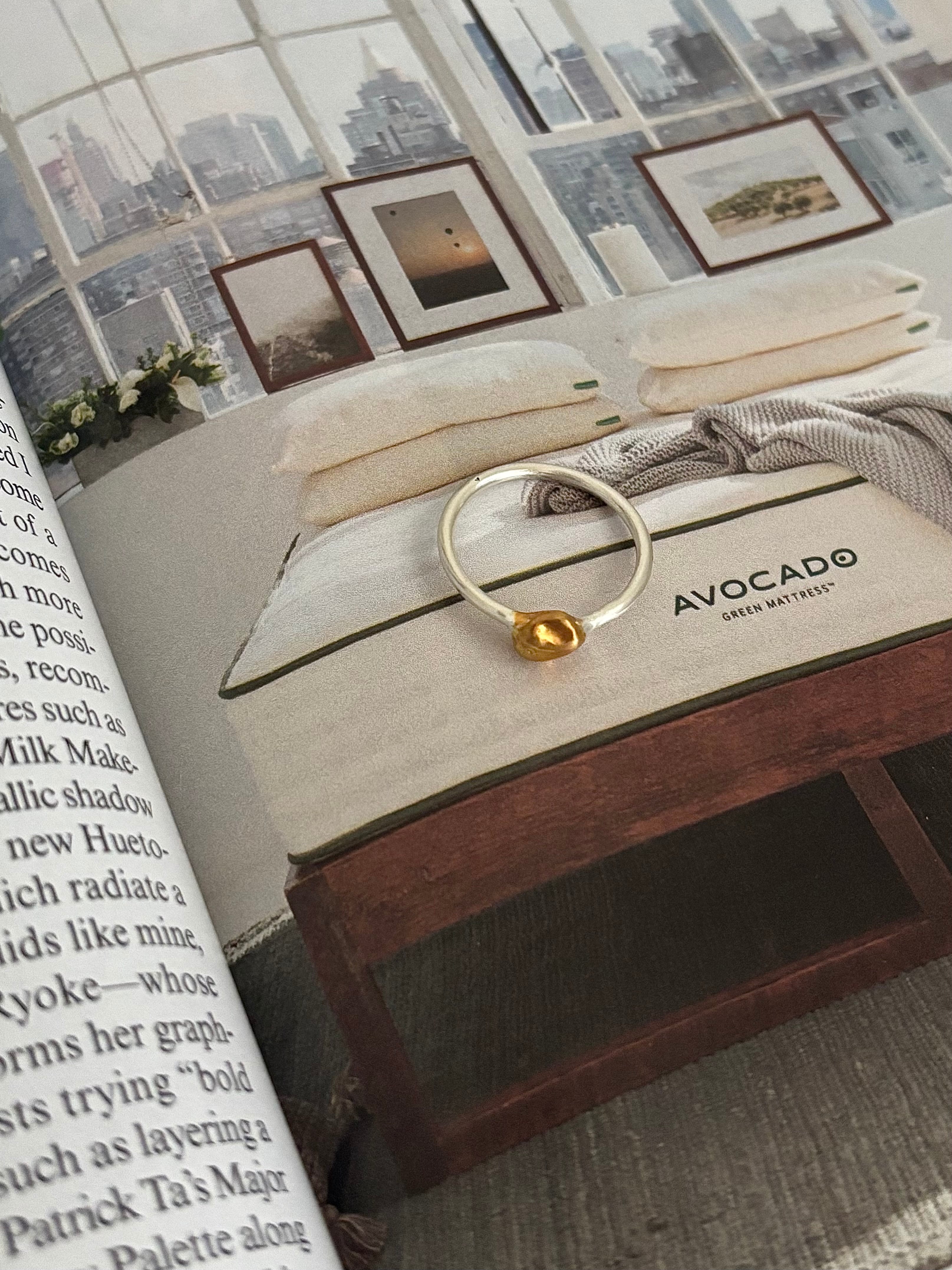 マットな質感で控えめな輝きを放つ、シルバーとゴールドの組み合わせが特徴のリングです。
